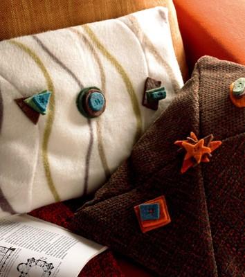 棉麻材質的靠包帶來一股清新溫暖的自然風,視覺與觸感都很有親和力。以剪刀將各色毛氈剪出簡單的幾何圖形,選擇相稱的顏色與靠包進行搭配,不一定非要剪成正圓正方,有些“不規矩”的線條看起來反而更加真實可愛。