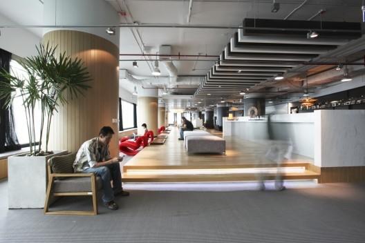 這是Hassell建筑事務所為泰國最大的電信供應商之一dtac設計的辦公空間,它能容納3500名員工,占地62000平方米,共有超過20層。Dtac公司的理念是在玩中學,設計很好地將這一精神融入進設計,挑戰傳統的辦公空間概念。設計在于將這一理念傳達給每個員工和到訪者。