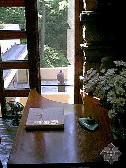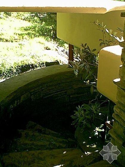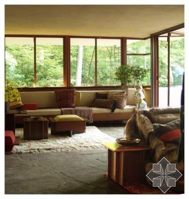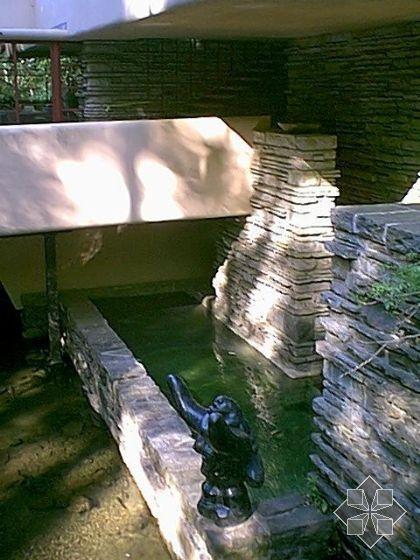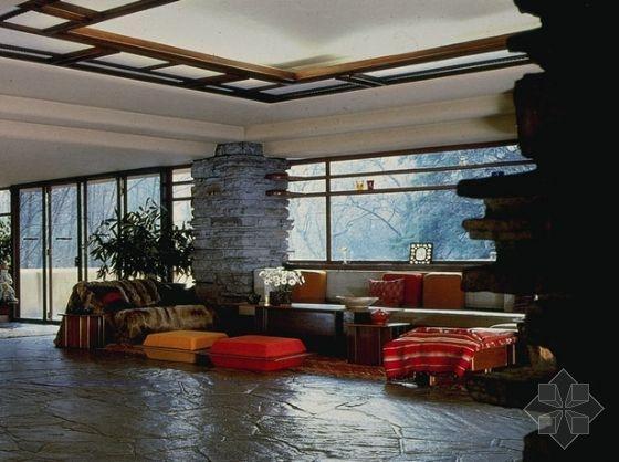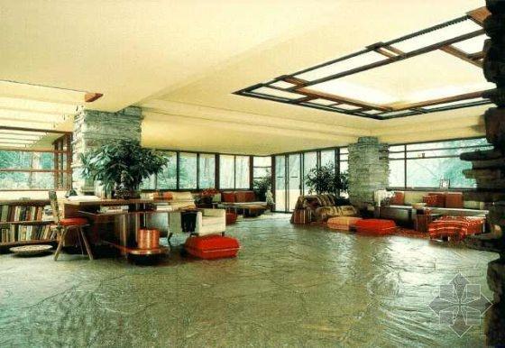 不同凡響的室內(nèi)使人猶如進(jìn)入一個(gè)夢(mèng)境,通往巨大的起居室空間之過(guò)程,正如經(jīng)常出現(xiàn)在賴特作品的特色一樣,必然先通一段狹小而昏暗的有頂蓋的門廊,然后進(jìn)入反方向上的主樓梯透過(guò)那些粗獷而透孔的石壁,右手邊是直交通的空間,而左手便可進(jìn)入起居的二層踏步,賴特對(duì)自然光線的巧妙掌握,使內(nèi)部空間仿佛充滿了盎然生機(jī),光線流動(dòng)于起居的東,南,西三側(cè),最明亮的部分光線從天窗瀉下,一直通往建筑物下方溪流崖隘的樓梯,東西,北側(cè)幾呈圍合狀的室,則相形之下較為暗,巖石陳的地板上。隱約出現(xiàn)它們的倒影,流布在起居室空間之中。從北側(cè)及山崖是反射進(jìn)來(lái)的光線和反射在樓梯的光線顯得朦朧柔美。在心理上,這個(gè)起居室空間的氣氛,隨著光線的明度變化,而顯現(xiàn)多樣的風(fēng)采。[page]
