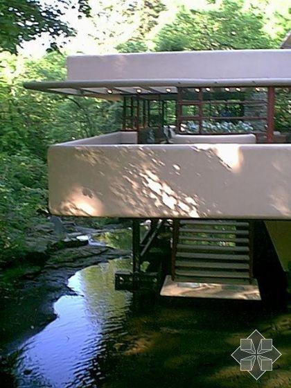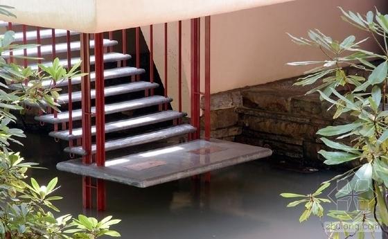 在材料的使用上,流水別墅也是非常具有象征性的,所有的支柱,都是粗獷的巖石。石的水平性與支柱的直性,產(chǎn)生一種明的對(duì)抗,所有混凝土的水平構(gòu)件,看來(lái)有如貫穿空間,飛騰躍起賦予了建筑最高的動(dòng)感與張力,例外的是地坪使用使用的巖石,似乎出奇的沉重,尤以懸挑的陽(yáng)臺(tái)為最。然而當(dāng)你站在人工石面陽(yáng)臺(tái)上,而為自然石面的壁支柱所包圍時(shí)對(duì)于內(nèi)部空間或許會(huì)有更深一層的體會(huì)。因?yàn)槭覂?nèi)空間透過(guò)巨大的水平陽(yáng)臺(tái)而延伸,銜接了巨大的室外空間——崖隘。賴特對(duì)于國(guó)際形式主義空談機(jī)能主義的態(tài)度,濃縮地表現(xiàn)在由起居室通到下方溪流的樓梯。這個(gè)著名的樓梯,關(guān)聯(lián)著建筑與大地,是內(nèi)、外部空間不可缺少的媒介,且總會(huì)使人們禁不住地一再流連其間。 [page]