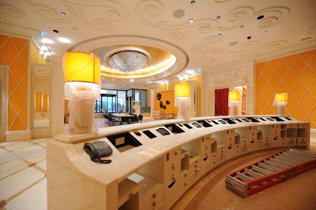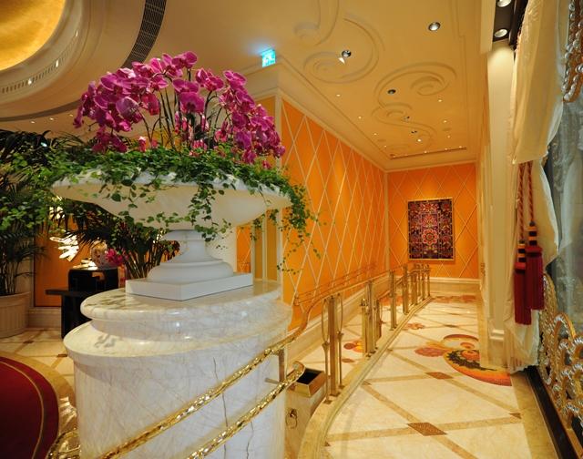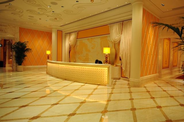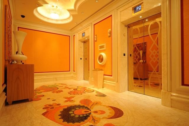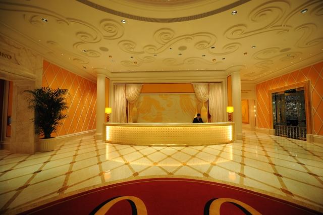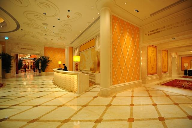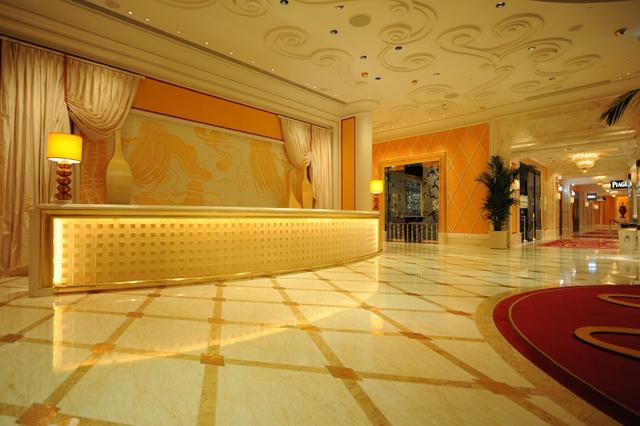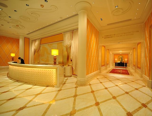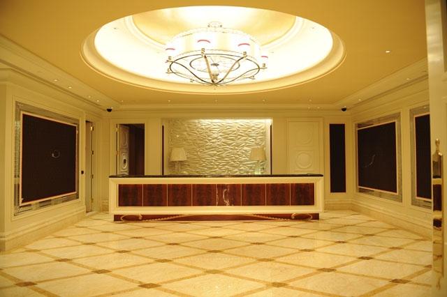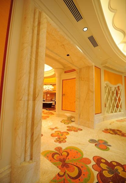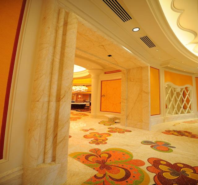 金蜘蛛以其雜亂無章的紋路,在大理石材品種中猶如璀璨的鉆石般分外奪目。設計師將金蜘蛛大面積運用在永利鉆石賭場的地面,將室內空間打造得猶如鉆石般富麗堂皇高貴無比;設計上用金蜘蛛的雜亂無章和規則的菱形圖案做強烈的對比,以動靜結合的設計帶出強烈的視覺沖擊。其整體裝修堪比泰國皇宮的豪華大氣,細節部分處理精細合理,營造出安詳舒適的感覺。