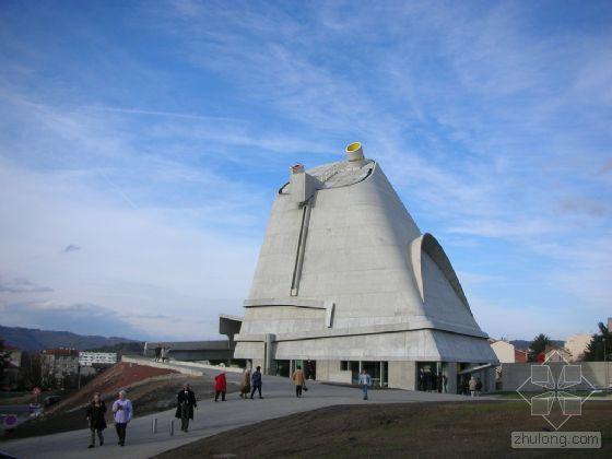 勒·柯布西耶,法國現(xiàn)代建筑的巨人,在50年的職業(yè)生涯中,他的大作遍及歐洲、印度、和俄羅斯和南北美洲。作為勒_柯布西耶為菲米尼城設(shè)計的一組建筑中的最后的一個收官之作,該教堂直到2006年都尚未完工,此時距他去世已經(jīng)有整整41年。其錐型頂在2000年由法國混凝土生產(chǎn)商拉法基提供的一種叫阿基利阿(Agilia)的特殊的混凝土構(gòu)建而成。法國政府同意為這個從上個世紀(jì)70年代起停工了的建筑的收尾工程買單,但前提條件是只能作為藝術(shù)中心使用,因為法國法律禁止政府在宗教項目上花錢。[page]