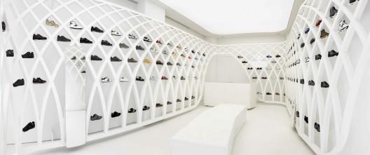 場館空間被金屬結構定義,它們相當于是場館的第二層皮膚,它們環繞已有空間,兩者之間沒有任何接觸,同時可以展示鞋子。作為體育時尚品牌的MUNICH近日在西班牙的巴倫西亞開設一店,專營店由Dear design公司設計,它在展示鞋子的同時將游客沉浸在一個體育場館一樣的環境中,內部充滿光線,并有很多懸掛的金屬結構。