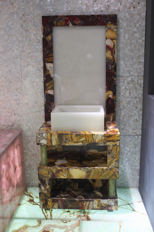 品名:洗手臺,材料:蛋黃瑪瑙+綠玉石支撐柱,設計思想:簡約,奢華。