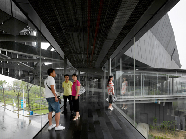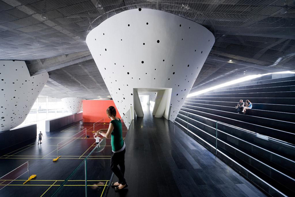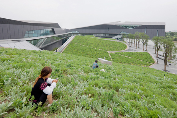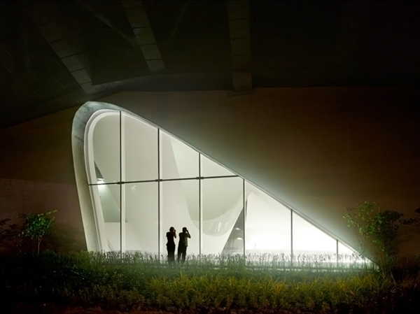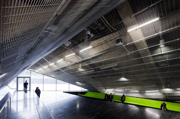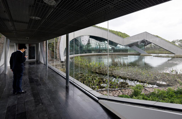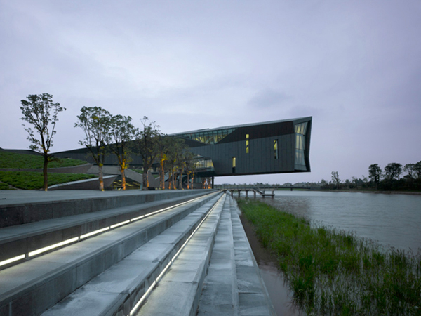 這座建筑位于一個大型人工湖畔,并用開放的建筑語匯展開它的首層平面,起伏的形態創造了一個凌駕于湖面之上的巨大懸臂。西側的體量擁有一個擺動的綠化屋頂,這個屋頂一直向上延伸到辦公樓,為辦公空間降溫并并節省了制冷費用。地面上布置了一系列向下的臺階,將公共人群和社會活動引導到人工湖畔。