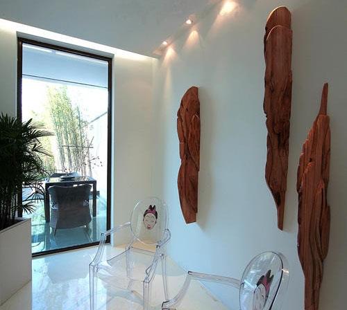 為體現(xiàn)現(xiàn)代的中式風(fēng),設(shè)計(jì)師把別墅外的墻體和窗戶選作構(gòu)思的落腳處,整座別墅的外部被賦予了很濃的“文化”氣息,采光用的窗戶和仿照徽派建筑的圍欄式院墻都是“墨跡斑斑”,玻璃窗表面鑲嵌上了密密麻麻的古文,巨大的墻體表也被靈動(dòng)的水墨筆痕所覆蓋,黑白相印,筆墨留香。而從屋里的巨幅壁畫和家具擺設(shè)看得出,設(shè)計(jì)師在細(xì)節(jié)之處?kù)`活地解決了時(shí)間的問題。