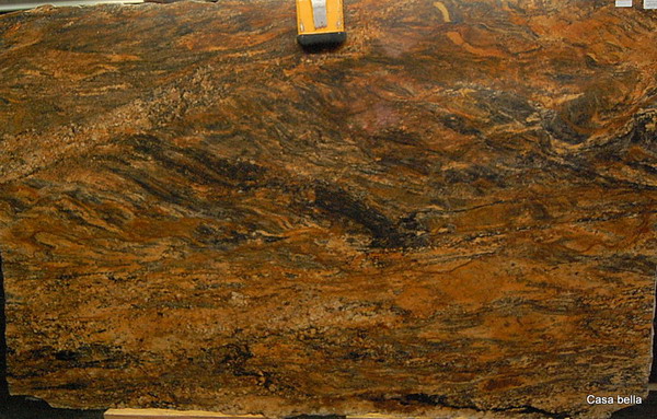 Rich saddle brown, black and cream flow in a wavy linear pattern across this granite.