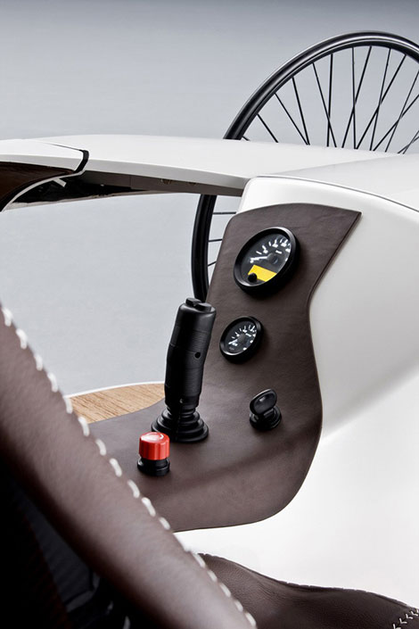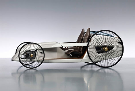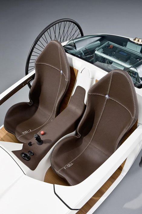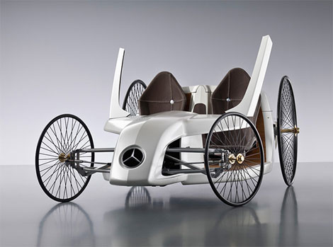 F-CELL Roadster類似于奔馳1886年制造的第一輛騎車,纖細車輪轂、沒有車頂,不過倒是多處了個輪子。它使用1.2kW燃料電池F-cell,奔馳稱其續航里程可以達到350km/h。F-CELL Roadster沒有傳統方向盤,取而代之的是類似直升機上的操縱桿。盡管包括內飾在內的多處部位均采用碳纖維材料,車頭造型也借鑒了F1賽車,但F-CELL Roadster 的最高車速只有25km/h,這大概也是其不會正式量產的原因之一吧。