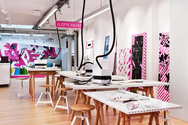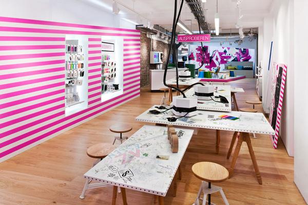 來自德國室內設計和建筑公司 PARAT,德國電信位于科隆的零售店設計。早就了解德國電信的企業色鮮活時尚,不過看到這個空間還是驚訝不小,PARAT 將波普藝術與公共空間的概念融入到店面設計中,整個空間充滿藝術氣息,4010定期會展出不同藝術家的新作品,它更像一個藝術家的工作室,而畫框,工作臺也都成了商品展示的媒介。