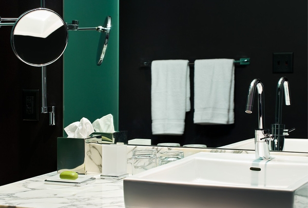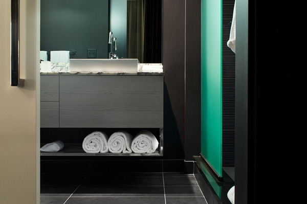 多倫多W酒店設(shè)計(jì) 如同大部分酒店設(shè)計(jì)一樣,在洗手間中使用白色大理石臺(tái)面板,簡(jiǎn)單潔凈。