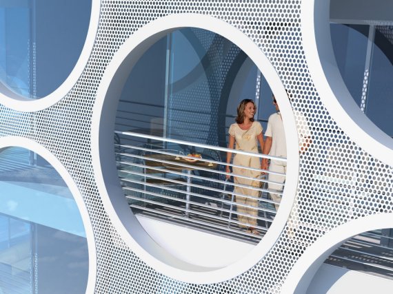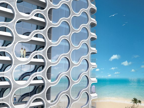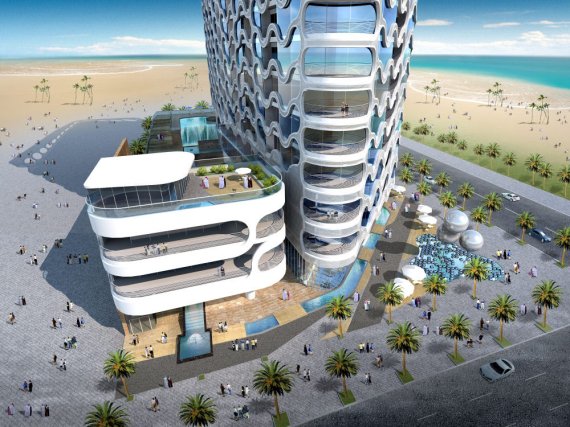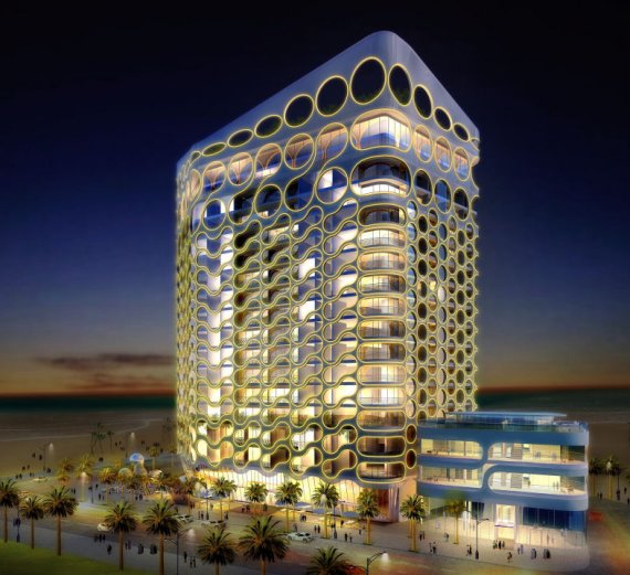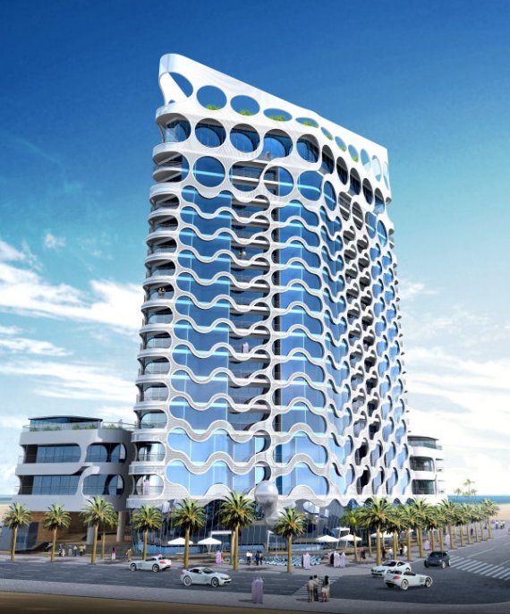 由設(shè)計師James Law Cybertecture設(shè)計的迪拜塔,靈感來自移動內(nèi)部的氣泡香檳玻璃,坐落于迪拜海濱,共18層,是一個富有想象力和獨特設(shè)計風(fēng)格的建筑,改項目將在2010年完成。
