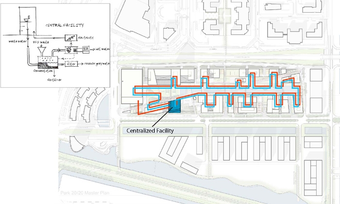 for an on-site treatment in the central facility. After purification, greywater is reused for