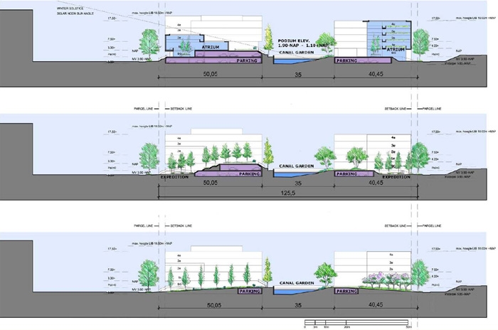 Building massing is adjusted to ensure solar access in the interior canal garden. Parking deck