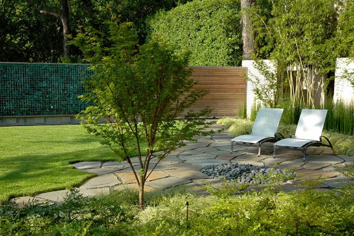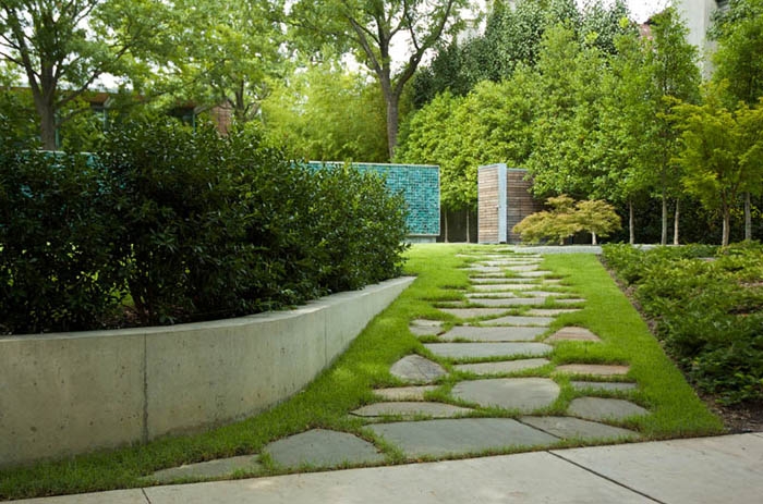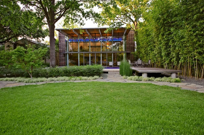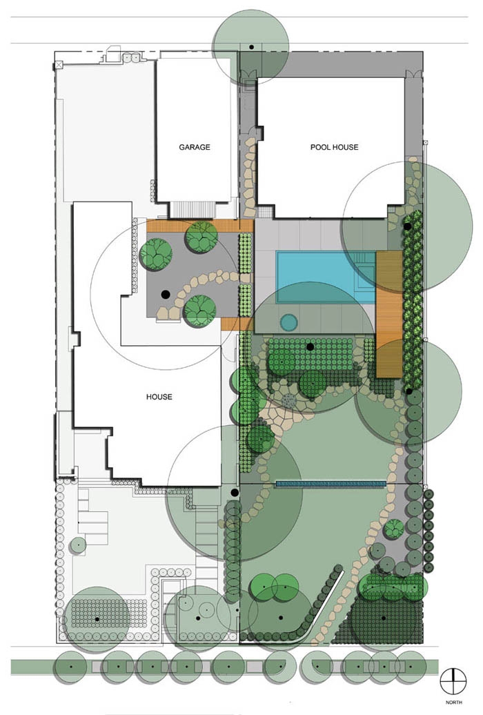 該項目是一個藝術和汽車發燒友的城市避難所。建筑師,客戶和景觀設計師緊密的合作完成。場地的中心有一面6英尺高的玻璃渣墻。內外之間渾然天成。極簡的植物色彩創造了大型整體紋理效果,大量的植物運用形成私密遮蔽的效果。