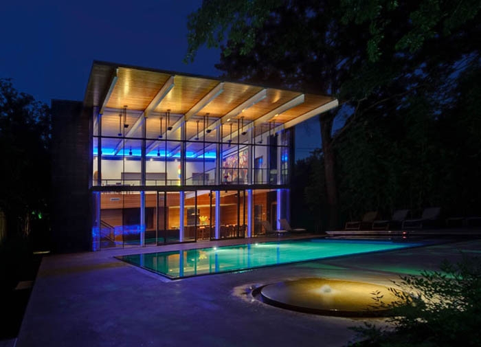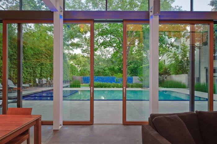 在項目中,客戶,建筑師和景觀建筑師通力合作,設計的想法被貫徹在每一個細節之中。客戶喜歡的顏色,藍色被納入花園之中,成為主導元素。場地的中間有一個6英尺高的隔斷墻。墻體是由不銹鋼籠子罩著藍色的回收玻璃渣組成。內部藏有燈光,會在夜間發出亮光。