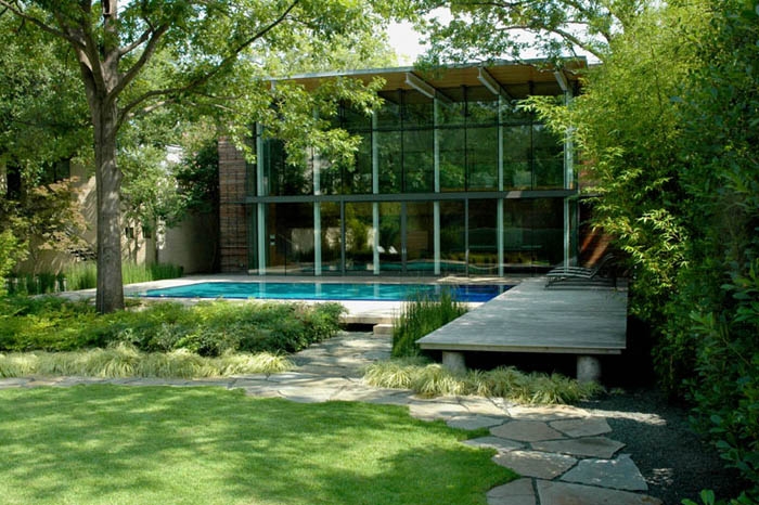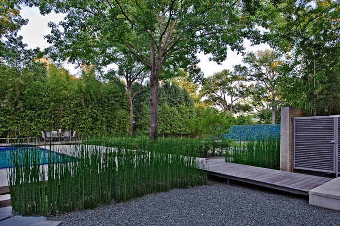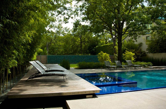 內外之間的天然過渡非常重要。泳池坐落在一個混凝土基座上,室內的混凝土地面自然延伸至泳池。泳池邊有一個混凝土平臺。混凝土平臺延伸進一個新的庭院,一片木甲板成為聯系的橋梁。最終到達至藍色的隔斷墻,墻體是由不銹鋼籠子罩著藍色的回收玻璃渣組成。強烈色彩,創建了一個非常強烈的視點,成為花園的焦點。泳池旁的混凝土地面有一個小型的噴泉,其微弱的水聲創造出了“蟬噪林逾靜,鳥鳴山更幽”寧靜氛圍。大石板路是整個場地的“脈絡”,提供過渡空間。這些蜿蜒的路徑到達各個目的地。群植植物形成大型統一的紋理效果,并引起數量眾多形成了安靜隱秘的環境。