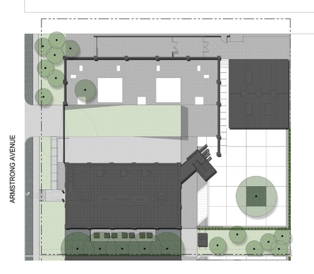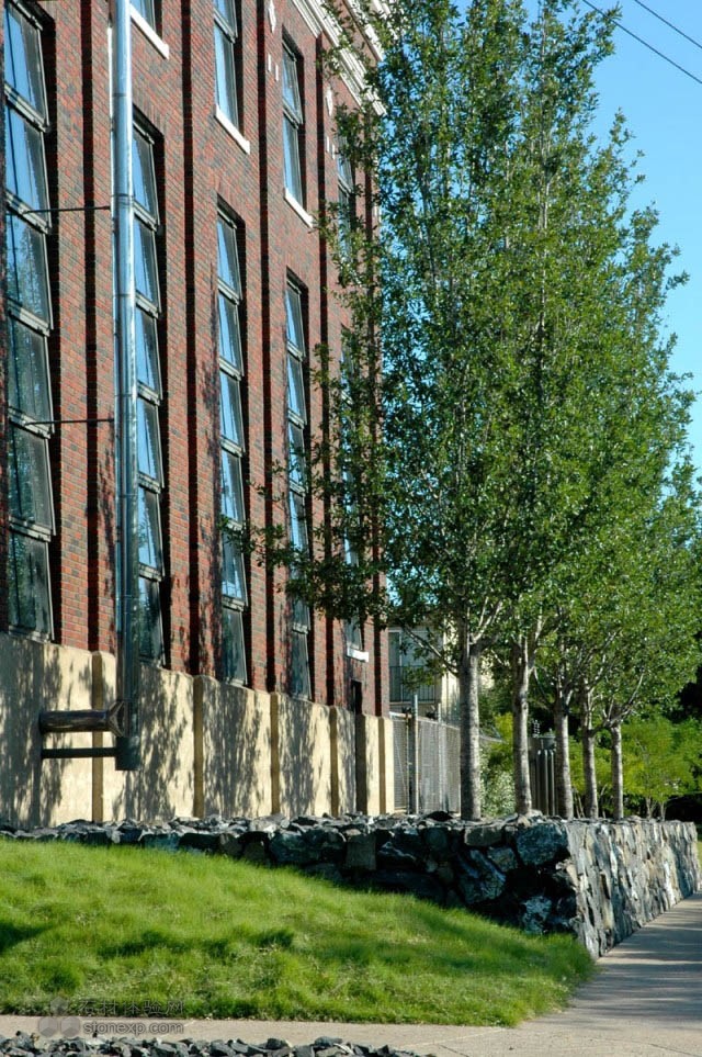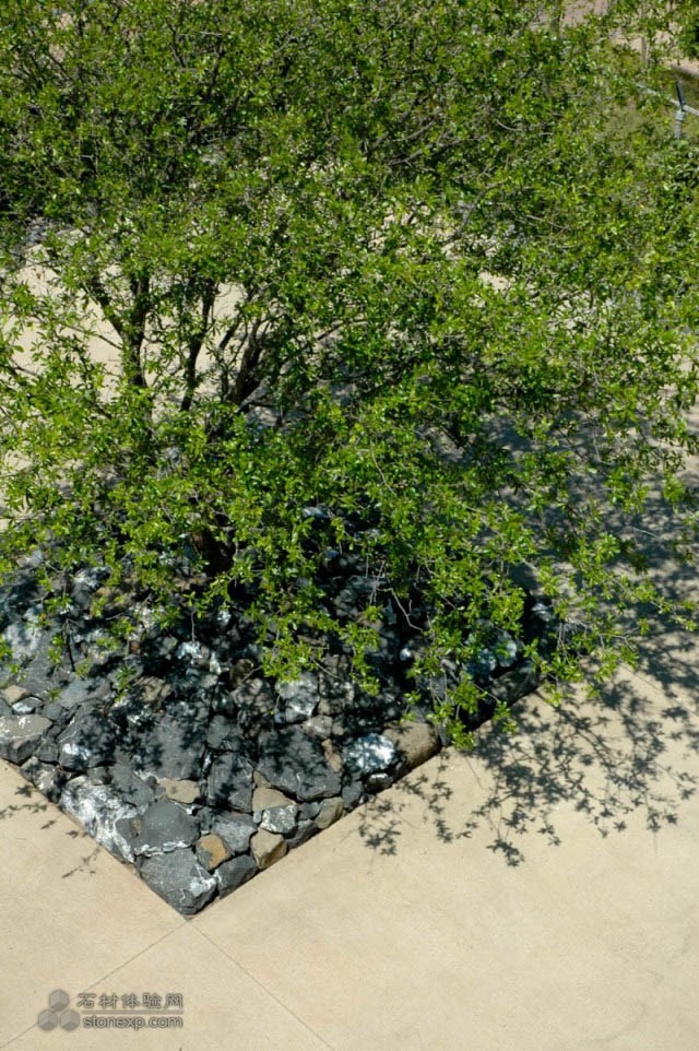 院墻不再封閉,整個庭院和城市有不錯的聯(lián)系,并運用非常自然的植物。柔軟的野牛草草坪低維護(hù),并且不耗水。庭院喬木四季季相明顯。一個巨大的花崗巖石塊基座在西側(cè)升起,緊鄰城市街道,是一景,也是一個過渡區(qū)。高大的橡樹生長在上面,并為建筑帶來宜人的陰影,避免西曬。