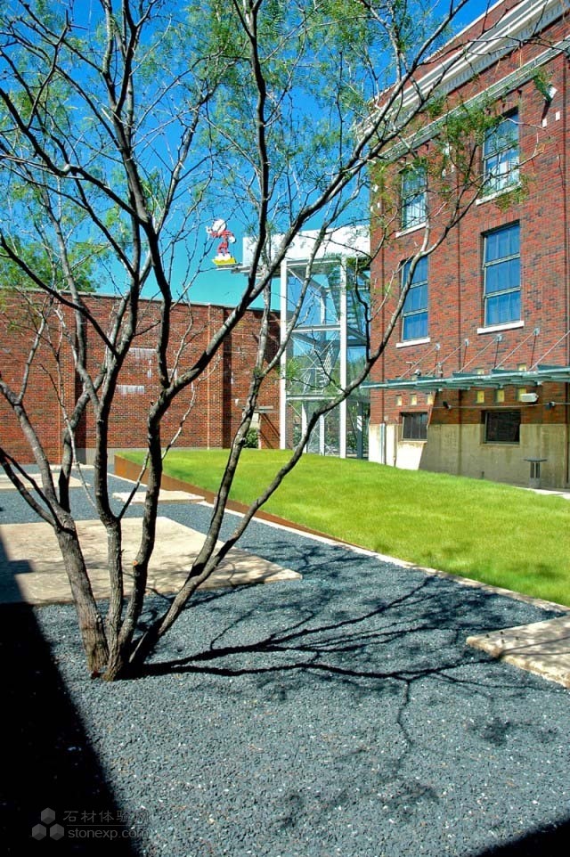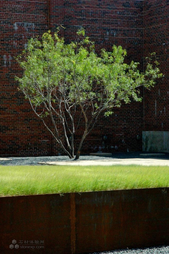 院內(nèi),微風(fēng)拂過,橡樹沙沙作響,這就是“活的雕塑”。樹坐落在很特別的花崗巖石塊基座上。樹蔭非常怡人,并隨著時間變化明顯。綠籬形成的綠色屏障,為這里提供一個私人的隱秘氛圍。內(nèi)部庭院四周是高大磚墻,以前這里有許多大型的工業(yè)設(shè)備。面對北門的是一片有著傾斜基座的野牛草草坪。傾斜的形體讓場地具有動感之美。草坪邊界的銹蝕鋼板看著挺像土層。微風(fēng)下,野牛草生機(jī)勃勃。這里放置著一顆庭院孤植樹,豆科的,它的陰影非常優(yōu)雅的點綴著庭院的地面。