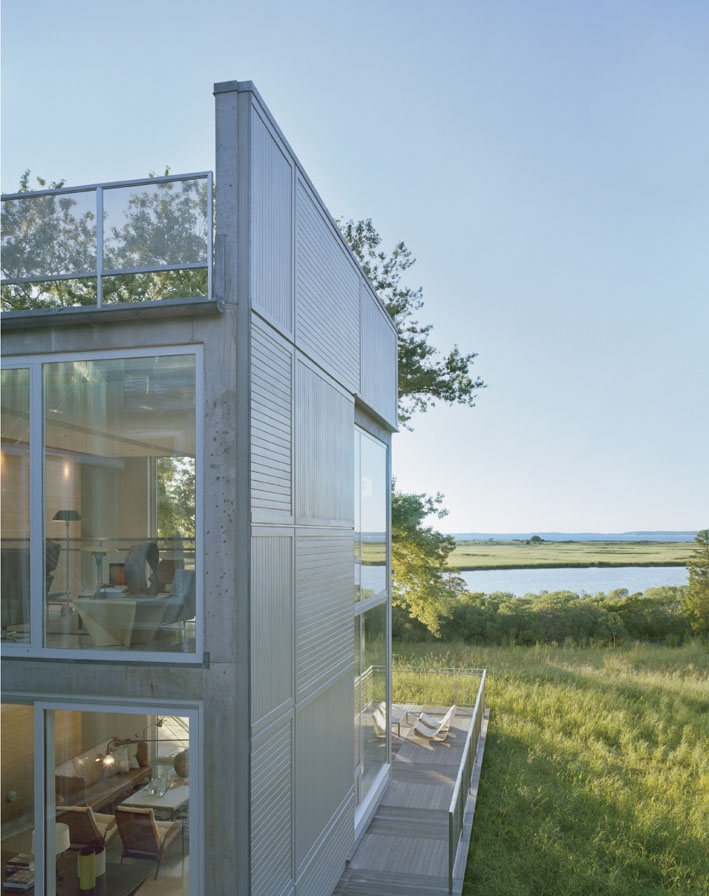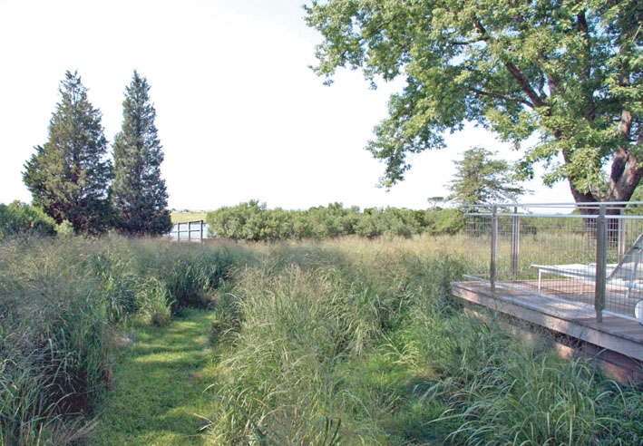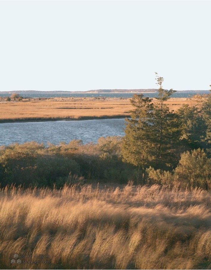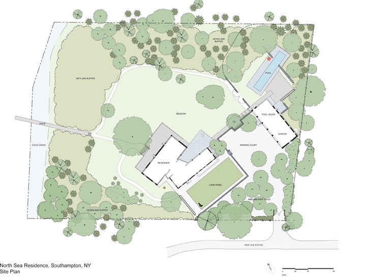 這個私人住宅建筑現代簡約,景觀也是同樣如此。項目位于長島的北海港,主要建設區域位于兩畝地上的兩片三角區域中。因為此處濕地(戴維斯河低洼區域)受到紐約環境保護部和南安普頓城市保護委員會的保護,因此沒有選用外來物種和鋪草坪等等傳統做法,而是營造一個原生復合植被區用以過渡緩沖。