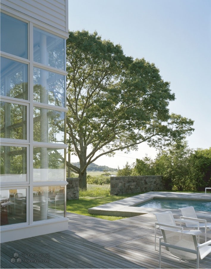 下面這個案例也臨湖,可能說是湖有點不太貼切,其實是河灘的小水泡子,一般講成濕地。詩意一點就叫成海子。一個小木橋輕輕的探到海子邊,就像輕輕的探到人心邊。最美的風景不會止步在這里,還在更遼闊的遠方。從橋上返回至建筑,院子變得現代,時尚。卻依然美輪美奐,和周遭景致和諧搭調。隨意抽取一個片段,即成畫。有幾幅剪影讓人不由想起路易斯.巴拉干,一樣的靜旎,不一樣的魔幻,平和,攝魂,以及詩意。