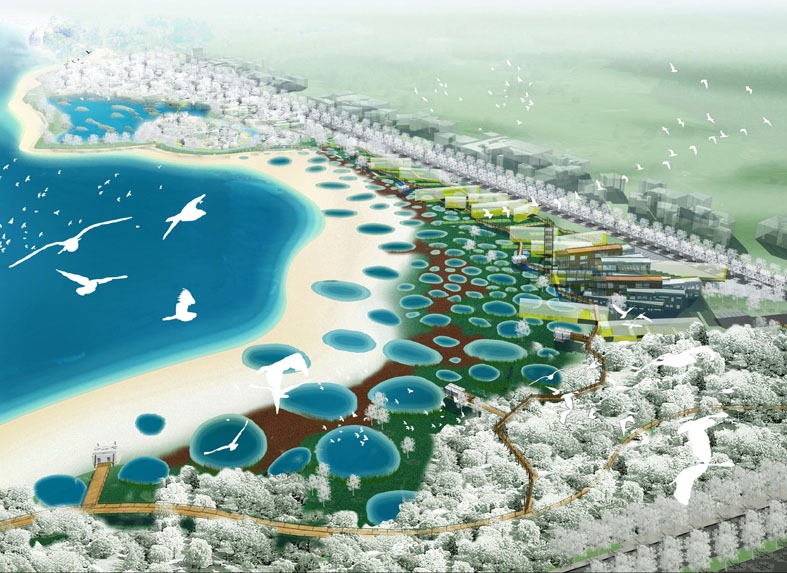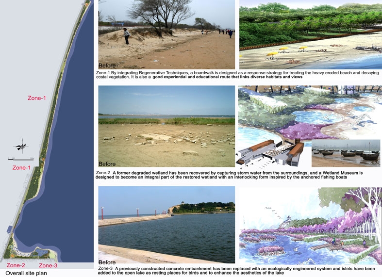 項目位于河北省秦皇島市渤海海岸,長6.4km,面積為60km2。整個場地的生態環境狀況遭到了嚴重的破壞。沙灘被嚴重地侵蝕,植被退化,一片荒蕪雜亂;之前的盲目開發破壞了海邊濕地,使之滿目蒼荑。項目旨在恢復受損的自然環境,向游客和當地居民重現景觀之美,并將之前退化的海灘重塑為生態健康且風光宜人的景觀。整個場地分為三個區域: