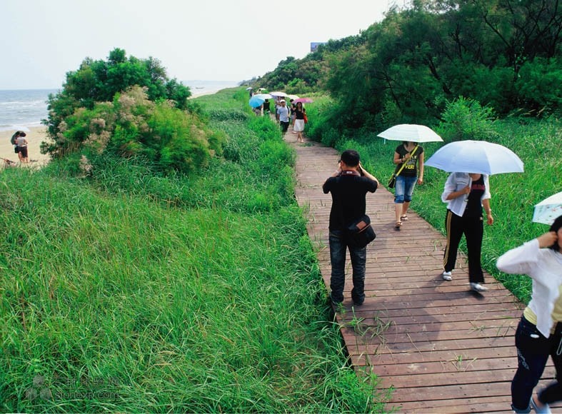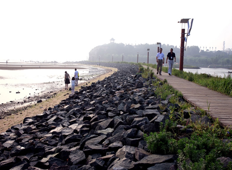 木棧道位于多風的海岸,綿延5km長,分布有沙丘以及各種適應多樣場地環境的植物群落:它們包括濕地的香蒲(Typha angustifolia)群落,沙丘草本群落,以及紫穗槐灌木叢(Amorpha fruiticosa),檉柳林(Tamarix chinensis),刺槐林(Robinia pseudoacacia)和旱柳(Salix matsudana)。長期以來,海岸線被廢棄、侵蝕和荒蕪,讓游客和居民難以靠近。設計方案巧妙地設計了一條隨海岸線蜿蜒的木棧道,將不同的植物群落連接在一起。木棧道不僅讓游客在途中體驗不同的植物群落,同時也作為一種土壤保護設施,保護海岸線免受海風、海浪的侵蝕。因為采用了生態友好的玻璃纖維基礎,木棧道能“漂浮”在沙丘和濕地之上。玻璃纖維基礎是特別預制的容器,根據土壤狀況可以事先填滿沙子,也可以中空。這種創新的專利技術(設計師發明并擁有專利)不僅比傳統建筑方法在自然環境中安裝木棧道更加簡易,同時,也把對環境的影響降到了最低。休息亭、遮蔭棚和環境解說系統沿著木棧道設置,全都根據周圍景色謹慎選址,使其能夠將場地的生態意義視覺化并突出了海岸的美麗景色。亭子變成了景點,吸引了成群的游客和當地居民來欣賞美景和休息游玩。