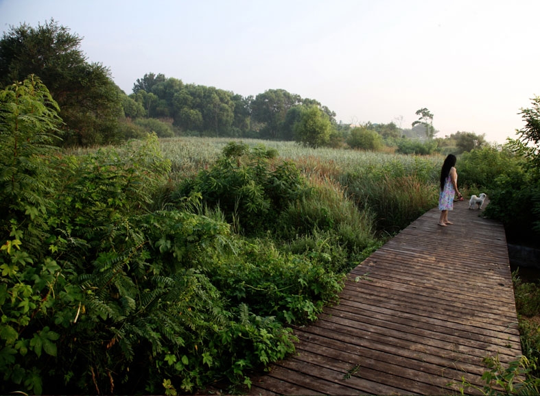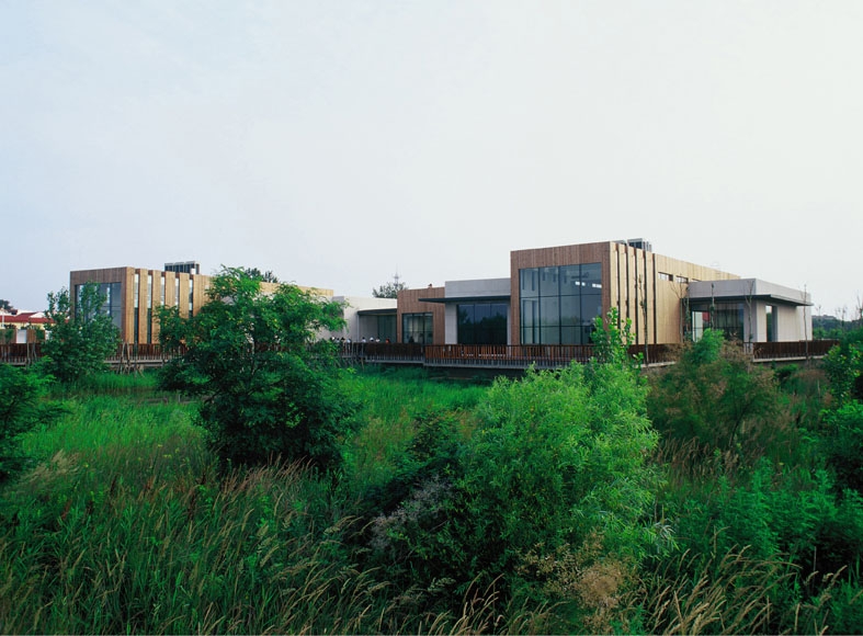中心區新建有一座鳥類博物館。它原先是退化的濕地,毗鄰被列為國家級鳥類自然保護區的潮間帶。之前的主題公園在建設時破壞了海邊濕地的生境,建筑廢物和垃圾遍布場地,生態修復的需求十分強烈,因此景觀設計師尋求一種能夠實現社會、生態和經濟可持續的方案,即在場地建造作為教育設施的濕地博物館,與遠處的鳥類自然保護區相呼應。受潮間帶的水坑景觀啟發,建筑廢墟周圍建成了泡泡來收集雨水,從而讓濕地植物和動物群落得以生長,并能吸引鳥類覓食。受當地漁船在海上集體拋錨使船在風浪中保持穩定的啟發,設計師設計了組合式的建筑及環境,濕地博物館延伸進濕地,與景觀融為一體。來自港灣的海風穿過建筑內部,驅散了盛夏的炎熱,并降低了建筑的能耗。木棧道和平臺系統讓人們能從建筑中走向濕地,觀賞新建成的生境與多樣的物種。