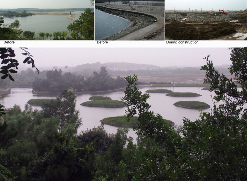 12 湖景改建后與以前的對比。小島成為鳥類棲息地,混凝土駁岸已被環保駁岸代替。