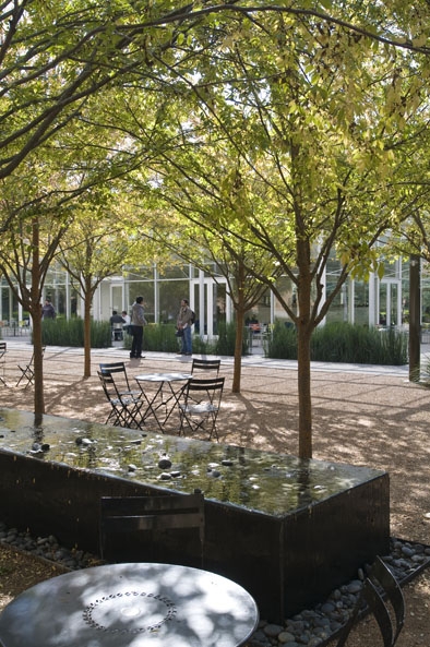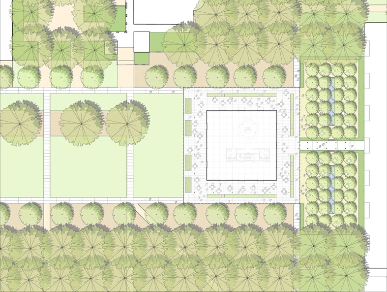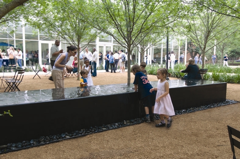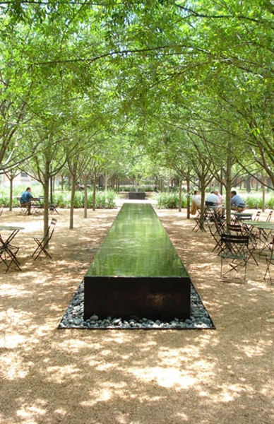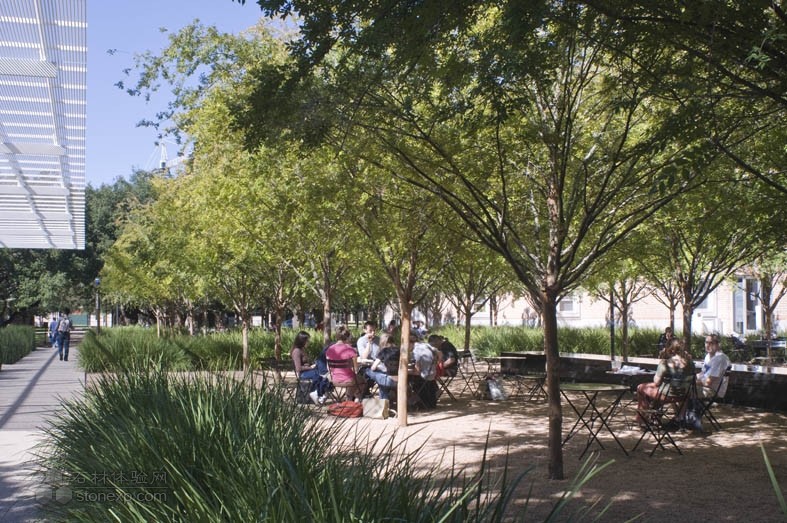 由于四方形形狀的限制,西面只限于加強了現有的空間架構,但新創建的Brochstein亭和圖書館之間需要一個更復雜的關聯,為了遙相呼應,設計師在風化花崗巖土質上栽植了48科榆樹灌木,形成一種空間框架,使得整個空間范圍變的人性化。一條混凝土小路將小樹林一分為二,道路兩側種滿非洲鳶尾花。布滿沙灘石的長方體黑色噴泉占據了每個空間的中心。潺潺流水反射著穿透過樹蔭的斑斑陽光。可移動的座椅以及這微妙的光影讓人們能夠享受這個有著濃濃樹蔭和流水的綠洲。