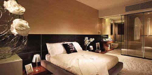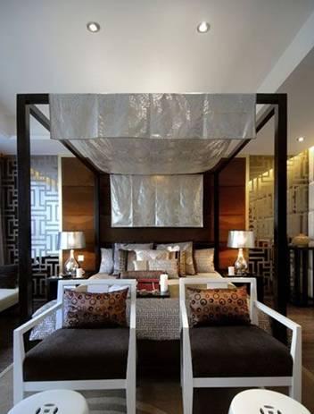 內斂大氣 中西風格另類混搭在需要悉心布置的臥室空間,每一處細節都是主人個性的體現。色調上采用棕色、灰色,給人感覺大氣內斂,西式的大床以中式的帷幔作為搭配,但是帷幔是采用流蘇垂在床的四周,令中西風格的混搭體現出一種另類的和諧。