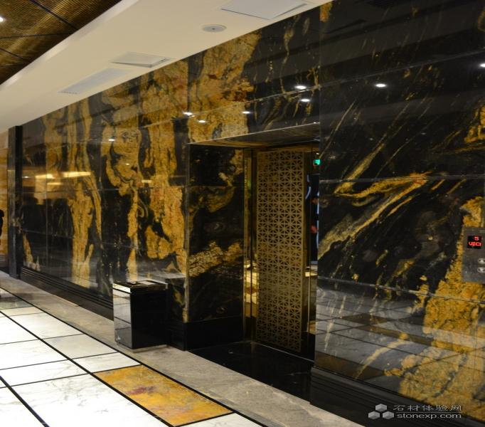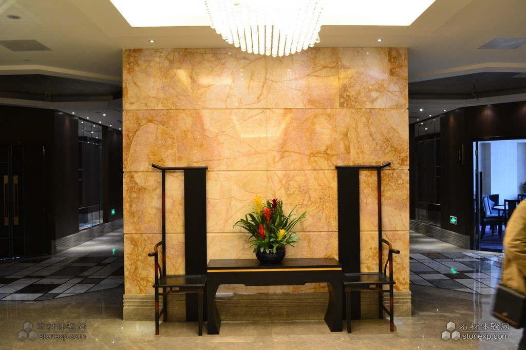 此時,墻面會成為一個裝飾亮點,可以選擇特色石材裝飾墻面。特色石材花紋夸張、自然隨意,能很好地表現創作意圖,適合在墻面上做藝術造型。如北京朝陽門金悅酒店墻面運用的特色石材路透社紋路流暢,流光溢彩的金色與沉穩含蓄的黑底相互襯映,彰顯出一派大氣、莊重的氣象,提升了設計師不凡的品味和藝術修養。