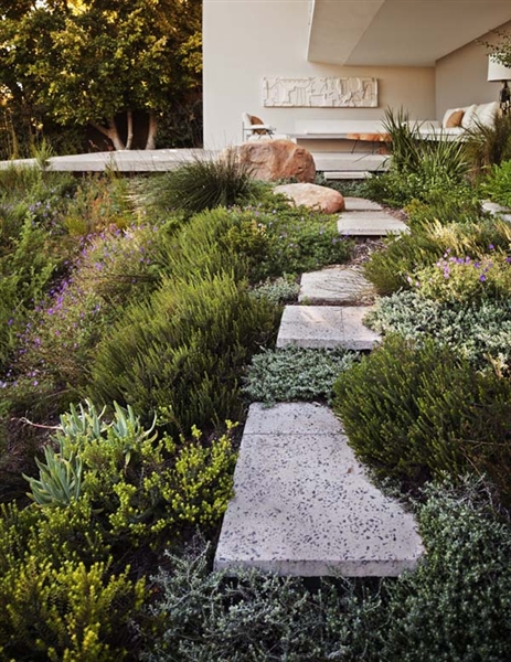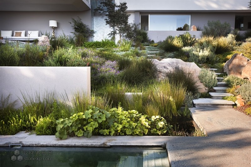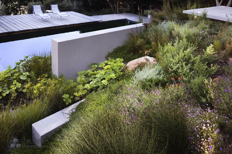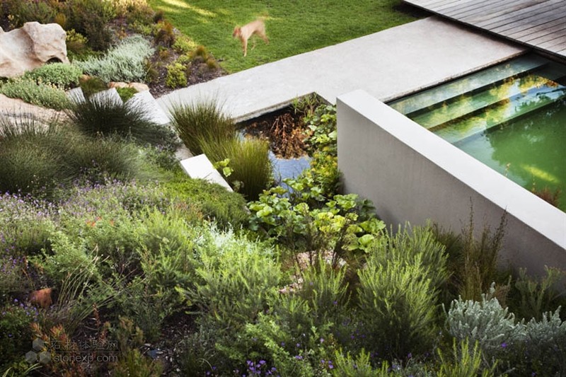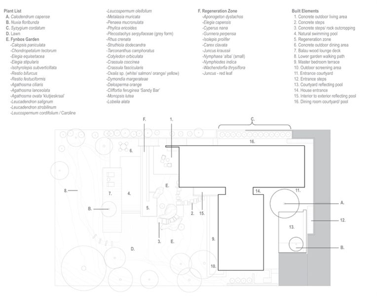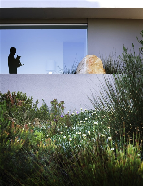 房子下方,是主要的戶外生活區(qū),有一個天然游泳池和非常豐富的花園。 原生植被都是當(dāng)?shù)匚锓N,具有高度多樣化的物種數(shù)量和范圍。開普敦地區(qū)是全球生物多樣性的中心。 數(shù)千不同的植物在這里爭相繁茂,喬木,灌木,草本和球根植物。所有這些植物在營養(yǎng)貧乏的原生巖石土壤茁壯成長。 在過去一個世紀(jì)中,外來物種入侵影響本地植物的繁殖。 設(shè)計使用原生植物并密集的種植在花園中,用以抵御外來入侵。設(shè)計為現(xiàn)場情況制訂了一個設(shè)計語言,但擁有完美嚴(yán)格的生態(tài)基礎(chǔ),真是非常獨特。