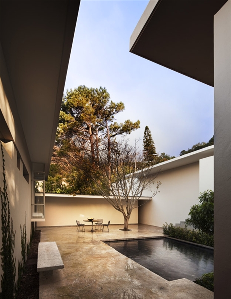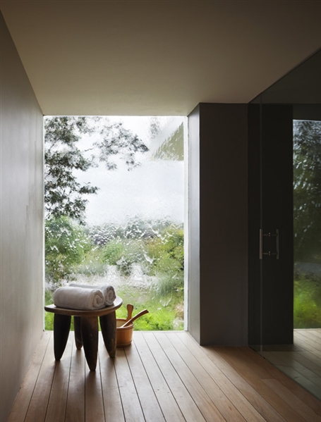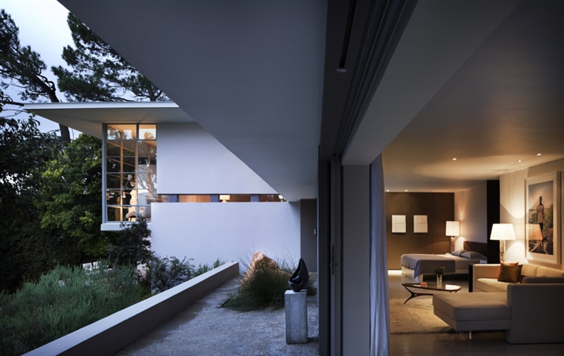 景觀設(shè)計不斷創(chuàng)造室內(nèi)外環(huán)境渾然一體的感覺。 漫步花園,通過的不同種植區(qū),到達(dá)戶外座位區(qū),可以避開山上的風(fēng),享有遠(yuǎn)處開普敦港的全景。由自由形態(tài)設(shè)計主臥室而延伸出的室外空間,從設(shè)計上可以弱化內(nèi)外之分。 瀑布不光提供天然游泳池曝氣,也充當(dāng)了桑拿房戲劇性的水墻。