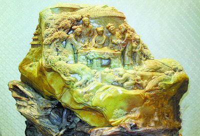 筆者在展覽現場看到,展出的1000多件壽山石雕,內容涵蓋了中西各種題材,九龍壁、香山紅葉、山西大院里的農家生活、蘇州河景觀、美人魚等等都栩栩如生地呈現在壽山石上,情趣盎然,別有韻味。