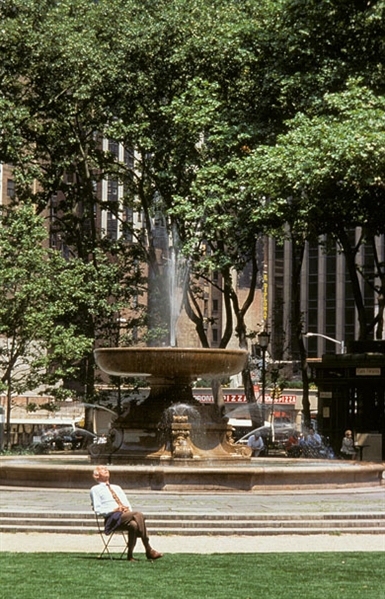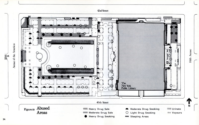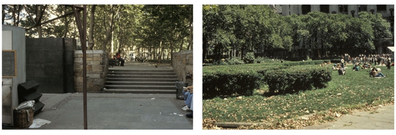 布賴恩特公園,毗鄰紐約公共圖書館。由于缺乏設計,在20世紀初,又因為缺少維護費而開始惡化。 雖然40年后,也就是1930年代經過了重新設計,但條件依然不斷惡化,到60年代,公園充滿了非法活動。 1966年,紐約時報把它說成一個吸毒者,妓女,流浪漢的天堂。 到了70年代初,警方甚至在公園所有入口設置路障,晚上9點以后禁止進入。