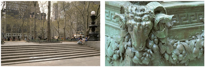 設計包含了很多能產生顯著成果的小調整。 景觀設計師在修改補充的入口,坡道,樓梯和行人路的同時,還減少柵欄的配置已達到更自由流通。 設計還包括在主要區域設置公共休息室和植入娛樂。 在設計過程中,1934年的石子路被重新翻新并在公園的中心區域設置介紹。中部需要嚴重維修和缺乏安全的設置則被拆除。 把草坪上擴大,兩側300英尺長的邊界上重者多年生草本植物和常青草,這一處理方法沒有形成一個物理或視覺障礙。用與紐約公共圖書館所使用的鑄鐵燈廠家生產雕塑。同時也加入了全新的噴泉。景觀建筑師承諾恢復公園長期可持續性的環境,并使用了天然材料。
