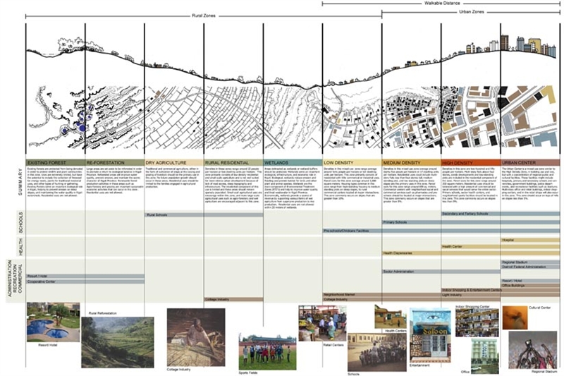 用斷面模型來說明,在未來的城市化時:建筑物,基礎設施,交通,土地利用方式和密度將如何的分布,應該怎樣相互影響。此模型很海涵,無論是復雜的,混合使用的開發設計,還是易于管理,定位明確的開發區等各項土地利用分類,都可以去參考。 比如,高密度的城市地區建議在高地上,而平坦,低洼地區和陡峭的斜坡則建議保存自然狀態。 市區的每一個混合使用的節點可以支持大多數人的日常活動。確定居民和行人的交通模式。
