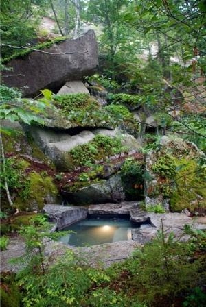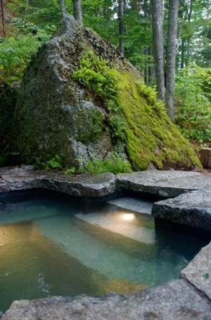 一個戲劇性的懸崖給了設計者靈感。溫泉的形式和材料非常自然。