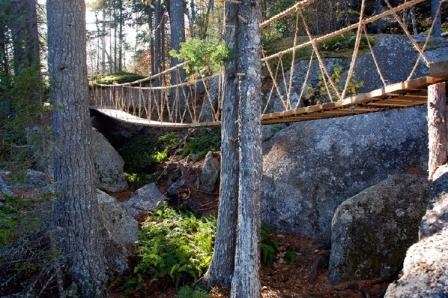 索橋固定在樹林和巖石上。