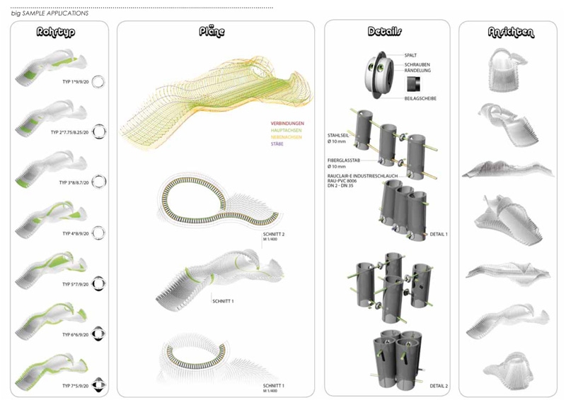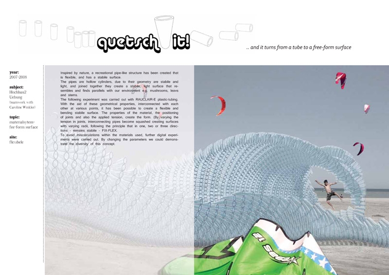 并實際的用塑料管做了實驗,每一個單元與其它單元的連接,單元所帶的幾何屬性可以創造出靈活,彎曲,穩定的表面。材料的性質使得關聯處充滿了張力,以創造形態。(材料關聯處能在幾個方向上進行改變,同時依然穩定。固定—彎曲)通過改變參數,證明了這一概念的多樣性。