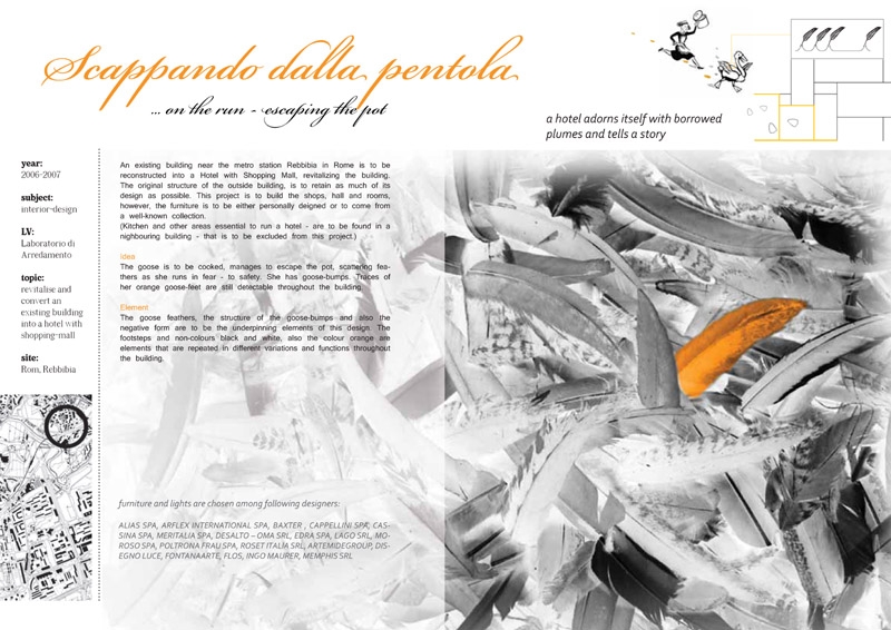 羅馬Rebbibia 地鐵站附近的建筑將被改建成一個集購物的大酒店。盡可能的多保留要有建筑風貌。項目要求設立商店,大廳,客房,甚至里面的家具都有親自選擇,組成一個明了的整體。(廚房和其它功能的設計體現,在這個項目中未被要求考慮)