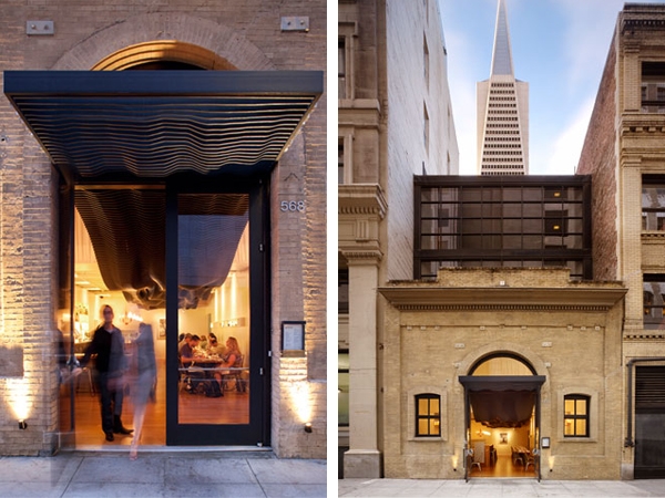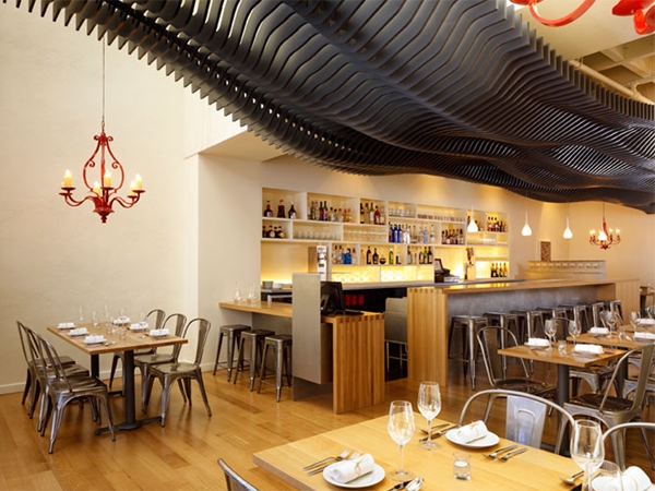 這是一個燒烤店。醒目的天花從門廊雨棚起串通入室內深處。