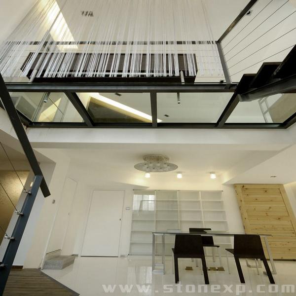 客廳、餐廳、門廳交界處的屏風是旋轉的,成為空間中的裝置藝術,在三個角度都能旋轉定位成某個空間的主體,電視機也可一物幾用。把餐廳的墻面用玻璃與滄桑的枕木圍合起來,既有視覺沖擊力,又宜于家居生活,方便清理;鋼架玻璃平臺順著樓梯向下層延伸,既保證地庫采光,又強調了空間的LOFT特征和力量感,簡煉純粹的空間配以鋼架、老枕木,注入了時間的滄桑和力度。