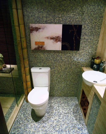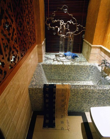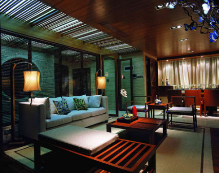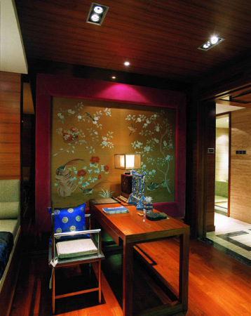 當踏入門廳,入戶花園的山、水、竹林、木雕,給人以世外桃源的感受,宮燈、鳥籠、古井、枯枝、茶具、青磚……無不體現東方的神韻。枯井的形式采用現代功能的手法,透過玻璃制的鏡面看到游水的魚兒。欣賞窗外美景,看魚兒嬉戲,啜一杯清茶,使人仿佛置身于都市的另一領域——休閑、寧靜、平和……