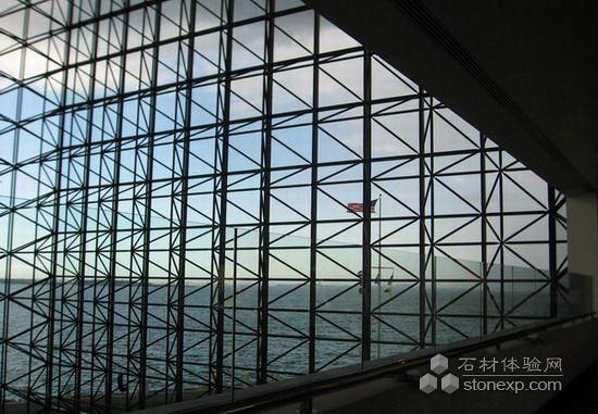 走進(jìn)了一條不長的黑色隧道,迎來巨大黑色玻璃幕墻,這里幾乎是個(gè)室內(nèi)廣場,十層樓高的玻璃幕墻由黑色鋼架支撐,除從頂部垂下一面巨大的美國國旗,其他什么也沒有。從玻璃墻往外看,非常明亮,波士頓港,多切斯特海灣,海天一色,盡收眼底。建筑師的精髓,展覽設(shè)計(jì)者的精心,都發(fā)揮的淋漓盡致。游人得到的是巨大感觸和情感沖擊。