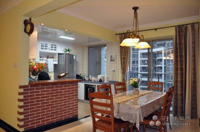 獨具風格的餐廳與開放式的廚房,讓整個空間變得開寬、明亮。因為主人特別要求的獨特吧臺的空間,設計師靈機一動利用這塊梁下空間量身打造了一個木制作的吧臺收納柜,由于屋內的收納空間原本規劃就不多,這個收納柜不但兼顧了造形也豐富了實用的功能,而造型磚是用紅磚片所占貼而成的,正好與入口玄關的地面、電視主墻呼應成趣味的映襯畫面。 而吧臺上的擦色落木紋的臺面、紅磚片等共同搭合而成也呈現了整體的居家設計質感。