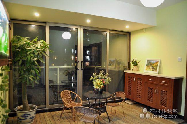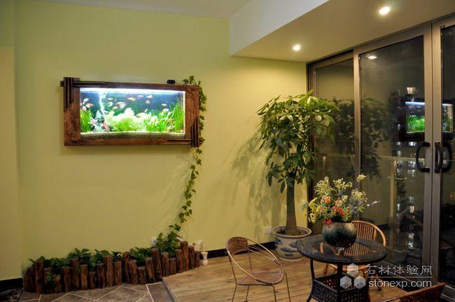 此案例的主人一直追求著鄉村風格的生活,因此,在入口玄關處的花磚及防腐木合鋪與掛式魚缸飄浮在肌理墻面上,加上特別處理的推拉門和攔桿結合,立即呈現出獨立成區的鄉村情懷!