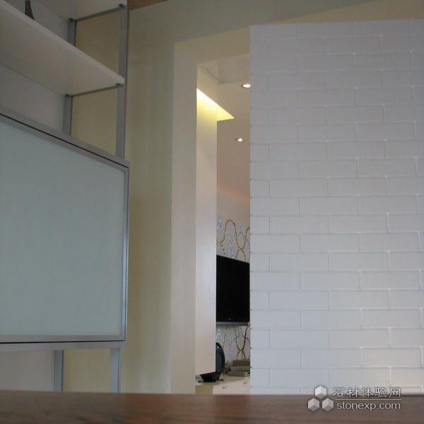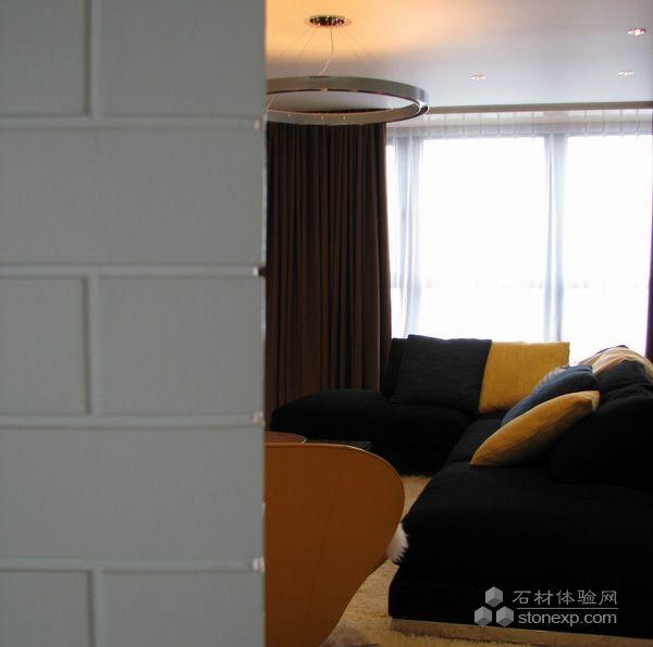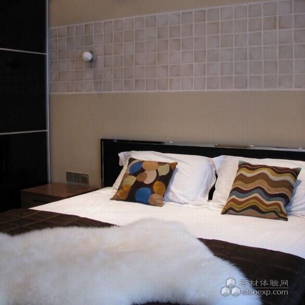 主臥室的空間格局采用了與衛生間在光線上貫通的方法:既衛生間淋浴區與臥室由一面清玻分隔,產生光與物及兩個不同空間的互動,產生他中有我,我中有你的現象,同時也由此拉長了人的視線,無形地擴充了空間,而改變了主臥室方方正正的呆板、沉悶格局,引發了空間的趣味性。