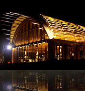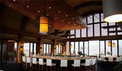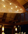 超大型的船形燈,與船屋建筑相呼應,燈光點點,如繁星一樣與夜空融為一體,木質(zhì)感覺的建筑更拉近了人與自然之間的距離,深色火山巖地面,粗獷又不失品質(zhì),這些都準確的演繹出中國文化的深厚內(nèi)涵。